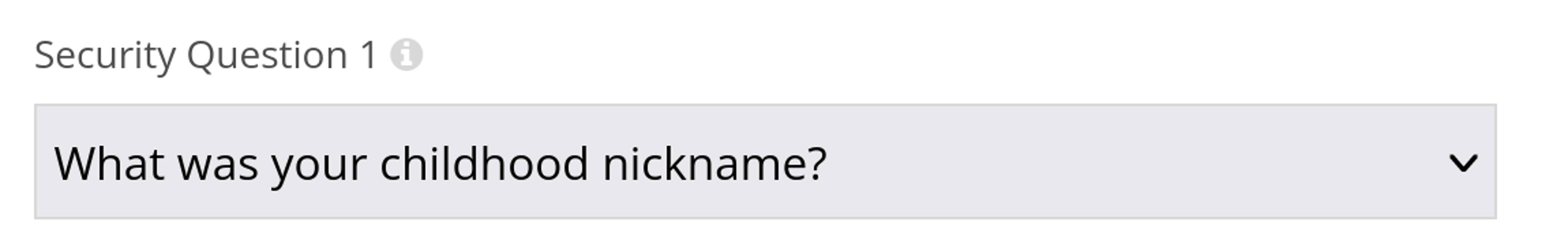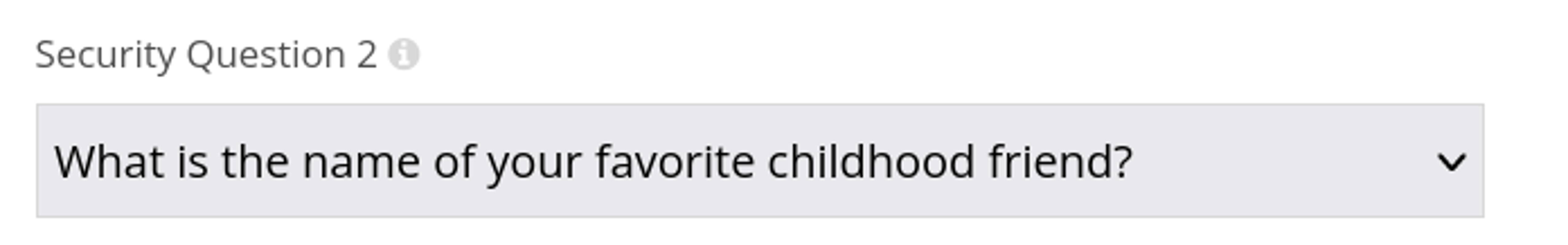 Click on a Security Question list. A list with available Security Questions will pop up. Choose one that interests you, then provide the answer for this question in the proper input field with the label “Security Answer 1” or “Security Answer 2.”
