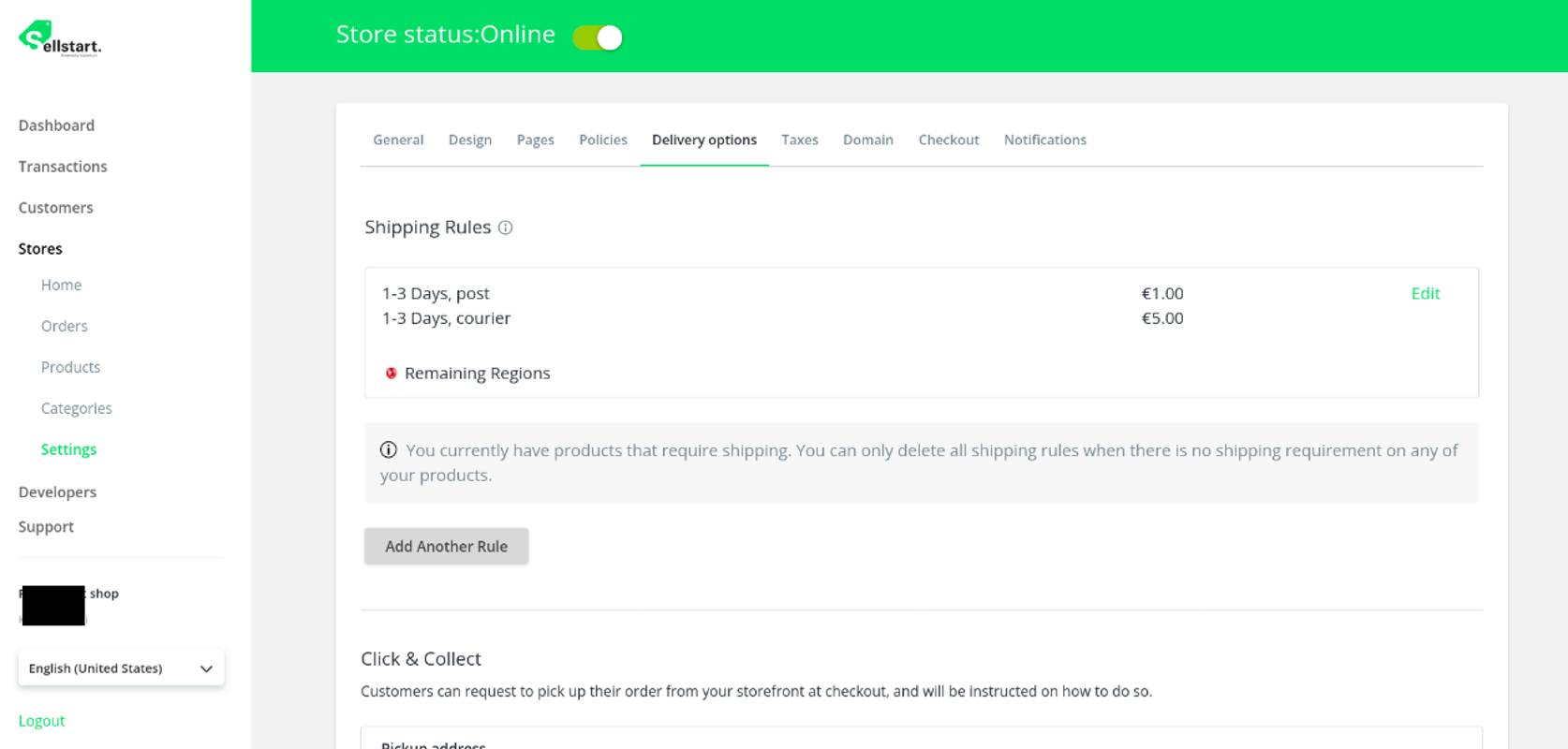 In the "Delivery options" tab, you can set up shipping options for your store.