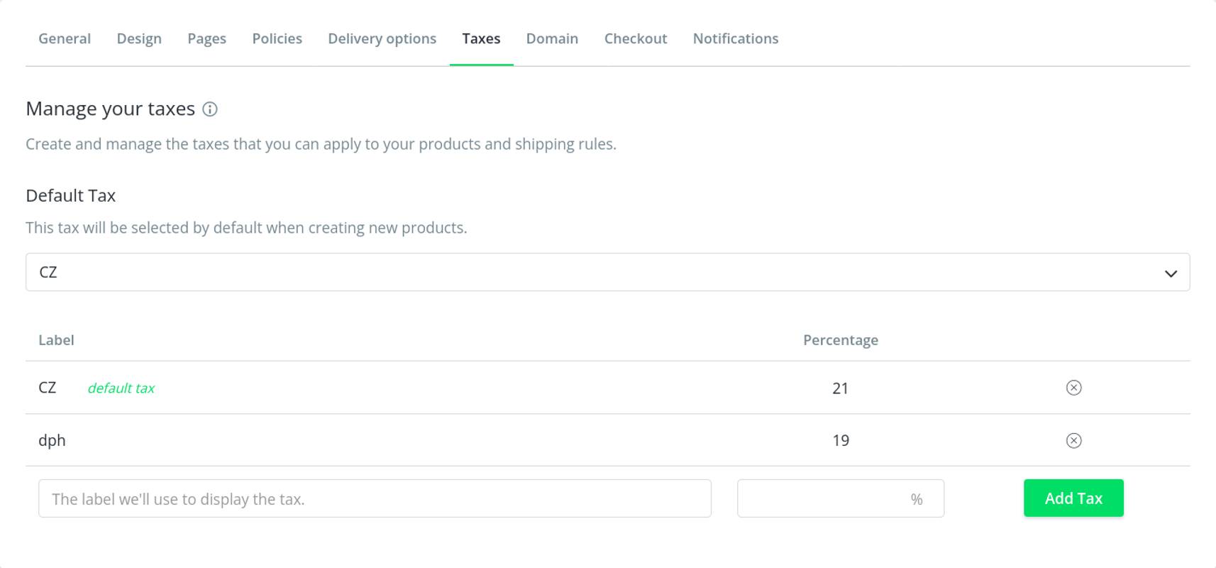 Here, you can configure tax rates based on the location of your customers. Input the tax rates for each region, and click "Add Tax" to store your changes.